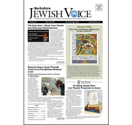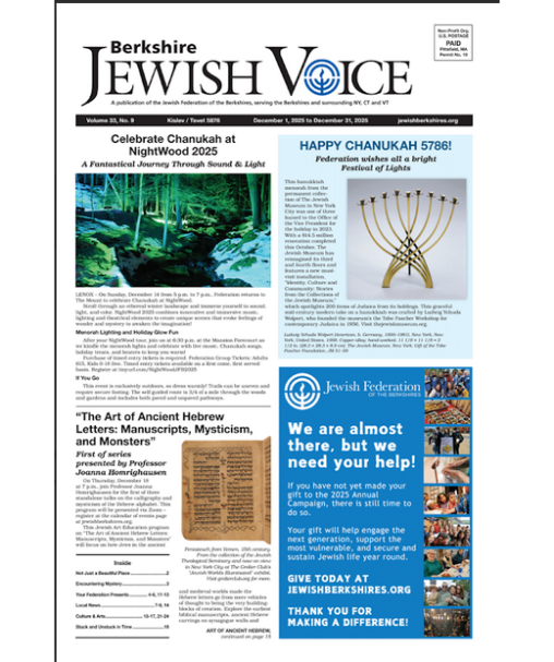 The Berkshire Jewish Voice is a free, non-profit newspaper published by the Jewish Federation of the Berkshires. The Voice is a key resource for the Berkshire Jewish Community, engaging over 5,000 readers in Jewish life and broadening our spiritual, cultural, and educational understanding through a mix of news, events, editorial, and dialogue.