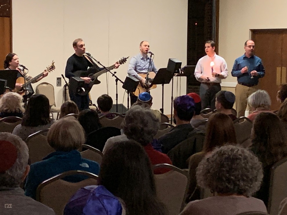 Photo: Rabbis at the annual Shabbat Across the Berkshires last January, Rabbi Liz Hirsch (far left), Rabbi Neil Hirsch (holding candle), and Rabbi David Weiner (far right).