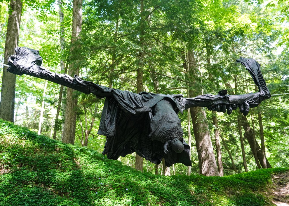 “Blackness is appropriate for my thinking” about this heart-wrenching subject, explains Miller, “but [“My Calvary”] also has a certain sparkle when it’s out in the sun that I consider hopeful. The way the work is placed in a spot of extraordinary beauty, amid the trees at The Mount, is also appropriate, because it contrasts the beauty of this world with what we human beings are doing to one another.”