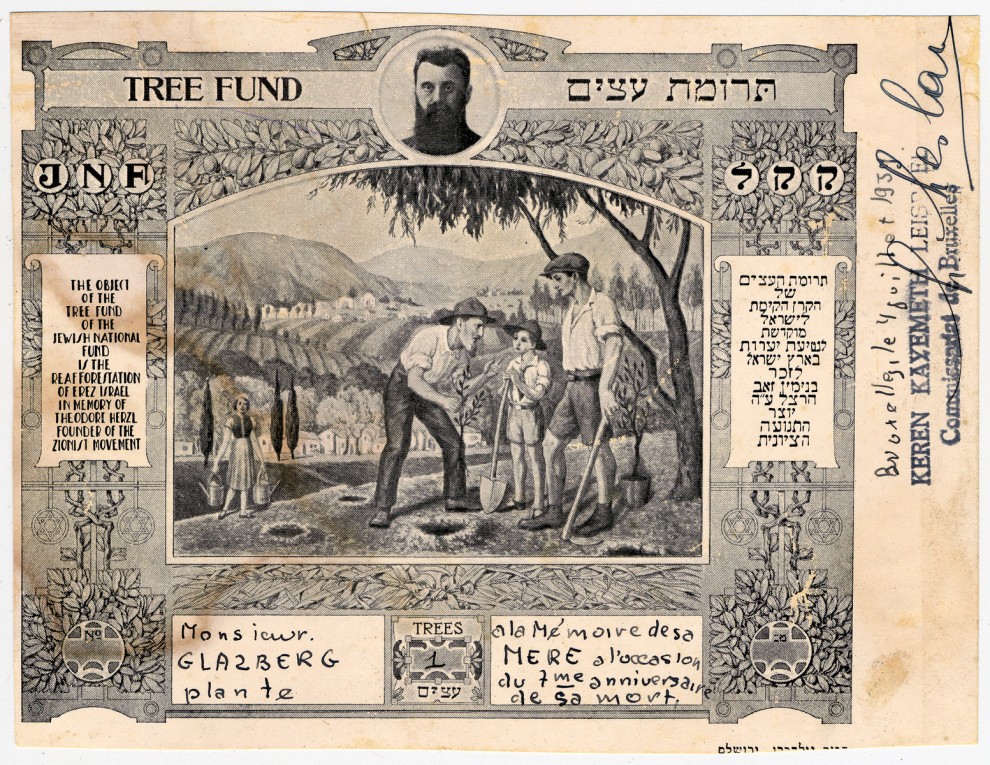 The image is of a Jewish National Fund certificate testifying that Samuel Glasberg planted a tree in Eretz Israel to commemorate the 7th anniversary of his mother's passing (1933). Credit: United States Holocaust Museum