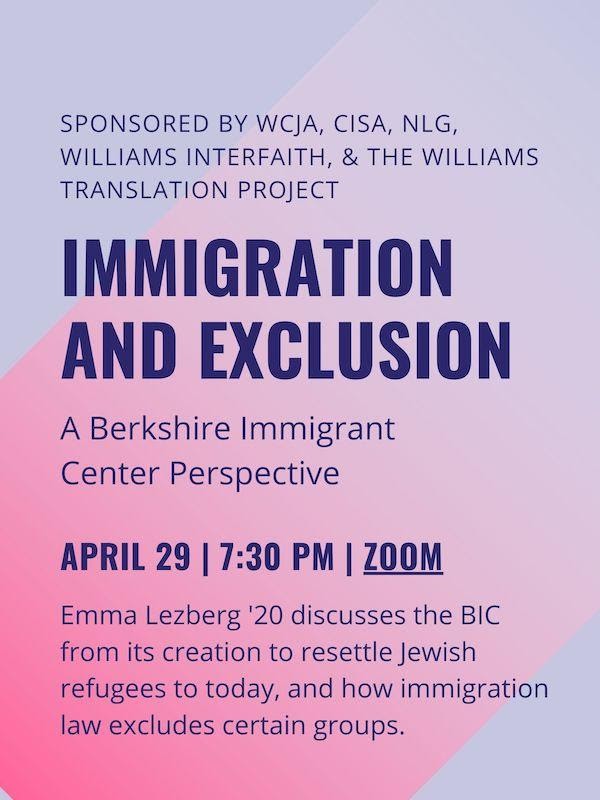 Join Williams College alumna Emma Lezberg, of The Berkshire Immigrant Center in Pittsfield, as she discusses the BIC from its creation to resettle Russian Jewish refugees to today, and how current immigration law excludes certain groups.