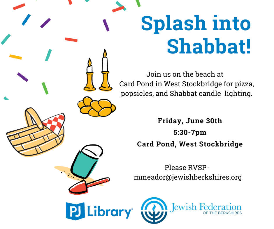 Join us on the beach at Card Pond in West Stockbridge for pizza, popsicles and Shabbat Candle Lighting.