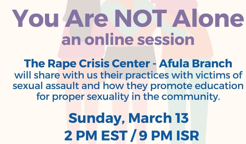 The Rape Crisis Center - Afula Branch's Aviv Tessler, Director of the Education Department at the Haifa Rape Crisis Center will share strategies for working with victims of sexual assault and how we can promote proper sexuality in our communities to prevent further abuse.