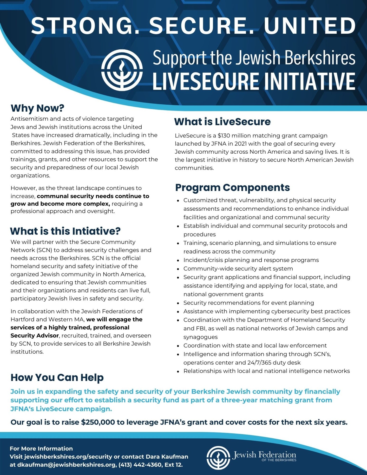 With your generous support, we can ensure that the Berkshire Jewish community is prepared to prevent and – if need be – quickly respond to any security threat. Gifts and pledges of any size are most welcome. To learn more about the Jewish Berkshires LiveSecure Initiative, or to make a gift to the initiative, please contact Dara Kaufman, Executive Director, at [email protected].